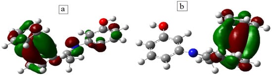 At the DFT level of theory, the full configuration of the free acetylferrocene azomethine ligand (HL) and its Co(II) complex was accomplished []. Figure S3 shows a perspective of the optimized structures of the HL and CoHL and their atom numbering. Table S1 show specified bond angles and distances of HL. The HL ligand shows distances (N2-C1) 1.30 Å, (N2-C3) 1.42 Å and (C6-O36) 1.40 Å. While in complexation, we observed stretching in these bonds to be (O22-Co) 1.71 Å, and (N7-Co) 1.59 Å (Table S2), respectively, which indicate the complexation through azomethine nitrogen and phenolic OH. Moreover, the Co(II) complex exhibited change in bond angles which confirm the complexation sites, HL shows angles C1-N2-C3 (125.78) and H37-O36-C6 (111.84). In CoHL complex, the angles which changed in Co(II) complex to be Co(21)-O(22)-C(3)56.14 and Co(21)-N(7)-C(1) 83.96 which confirming the chelation though azomethine nitrogen and phenolic OH. The major orbitals implicated in chemical consistency are the highest occupied molecular orbital (HOMO) and the lowest unoccupied molecular orbital (LUMO). The HOMO reflects the capacity to give an electron, whereas the LUMO as an electron acceptor reflects the ability to secure an electron. The HOMO and LUMO for the acetylferrocene azomethine ligand (HL) and its Co(II) complex were depicted in Figure 2. Table 3 lists the estimated quantum chemical factors. The Equations (1)–(8) below were used to derive further characteristics such as E, absolute electronegativities, chemical potentials, Pi, absolute hardness, absolute softness, global electrophilicity, global softness, S, and additional electronic charge, Nmax [,,,,].