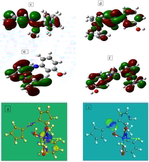 Molecular orbitals of the free acetylferrocene azomethine ligand HL (a) HOMO (b) HOMO-1 (c) HOMO-2 (d) LUMO (e) LUMO + 1 (f) LUMO + 2; and [Co(HL)(H2O)4]Cl2·2H2O complex (g) HOMO and (h) LUMO.