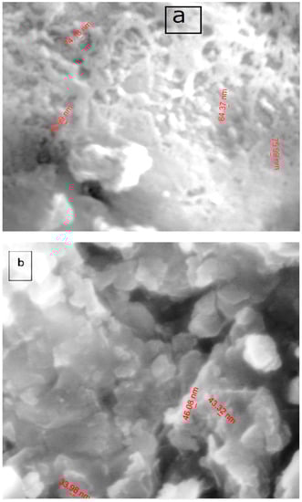 The surface morphology, structure, and size of the free acetylferrocene azomethine ligand and Cd(II) chelate were carried out using SEM images (Figure 3a,b). The SEM micrographs of the free ligand differed significantly from [Cd(HL)(H2O)2Cl2] complex owing to the coordination of metal cation to the donor sites in the free acetylferrocene azomethine ligand [,]. The morphology of the free acetylferrocene azomethine was net-shaped with a size of 64.73 nm which differed in Cd(II) complex to be a spongy shape with a size of 42.43 nm. SEM analysis yielded a size distribution that indicated that the acetylferrocene azomethine ligand (HL) and the Cd(II) complex were polycrystalline with nanosized grains [,].
