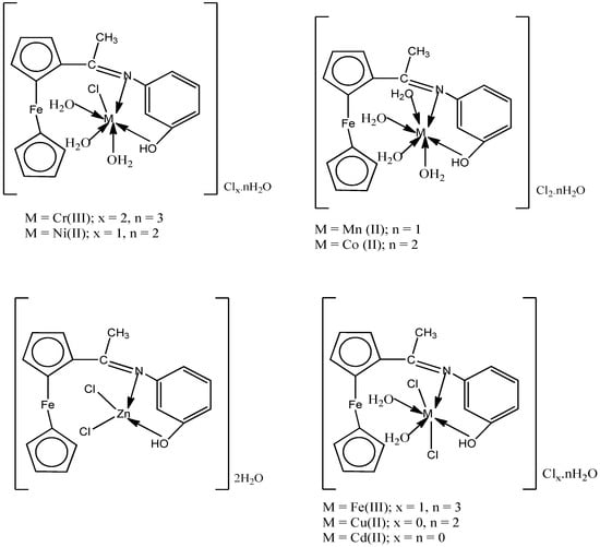 Elemental analyses and some physical properties of the newly synthesized acetylferrocene azomethine ligand and its metal chelates were recorded in Table 1. The experimental data of elemental analyses were in agreement with the theoretical calculation from each compound’s empirical formula. Acetylferrocene azomethine ligand was soluble in ethanol and its metal chelates were stable, nonhygroscopic, and soluble in most organic solvents such as DMF and DMSO and insoluble in ethanol, methanol and acetone. The molar conductivity values of metal chelate showed that all metal chelates were electrolytes except Cu2+, Zn2+, and Cd2+ cations were non-electrolytes [], indicating that no anions were located in the ionization sphere. The molar conductivity data for Fe3+ and Ni2+ chelates are close to those previously reported for 1:1 electrolytes [,]. In addition, Cr3+, Mn2= and Co2+ complexes have molar conductivity values close to 1:2 electrolytes.