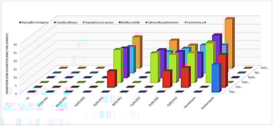 The examined compound’s antibacterial activity was assessed in vitro against the microorganisms Aspergillus fumigatus and Candida albicans (fungi), Staphylococcus aureus, and Bacillus subtilis (G + ve bacteria), and Salmonella typhimurium and Escherichiacoli (G-ve bacteria) by the diffusion agar method. The inhibition zone diameter values of the tested samples were represented in Table S3 and Figure 5, indicating that the free ligand, Cr3+, Mn2+, Fe3+, and Ni2+ metal chelates had no activity against some microorganisms, while other metal chelates showed some activity against some microorganisms, demonstrating the effect of chelation as the majority of metal chelates are more active than their respective azomethine ligand. In some cases, the free acetylferrocene azomethine ligand is more active than metal chelates against bacteria. Chelation either increases or decreases antibacterial activity; it can also be neutral. As a result, metal chelation may enhance or diminish the therapeutic effectiveness of organic molecules (drugs) [,,]. By further stabilizing the medication and/or lowering the biodegradability/metabolic decay of the organic ligands through chelation, the characteristic may be preserved []. The activity indexes of the tested compounds were calculated and plotted in Figure S5a,b according to the following equation [,]: