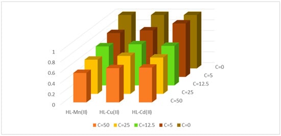 Only Mn(II), Cu(II) and Cd(II) metal chelates showed an inhibitory effect >70% against the MCF7 cell line, so they were carried out in four different concentrations; the findings were shown in Table S4 and demonstrated in Figure 6.