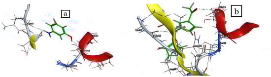 Molecular docking manipulations were conducted utilizing MOE2008 software, which is a stiff molecular docking software, to determine the probable binding affinity of the most active drugs against the receptor of oxidoreductase mutation in breast cancer (3HB5) []. Docking is a molecular graphics tool that calculates and displays possible docking modes between a receptor and 3-aminophenol, 2-acetylferrocene, free ligand, Mn2+, Cu2+, and Cd2+ chelates. These compounds, as well as the receptor, must be entered in PDB format. Water, co-crystallize ligands, ionization sphere (Cl), and other elements that are not supported (e.g., Na, K, Hg, etc.) were eliminated from the crystallization molecules []. Gaussian03 software was used to construct the structures of 2-acetylferrocene, 3-aminophenol, the free ligand, Mn2+, Cu2+, and Cd2+ azomethine chelates in PDB file format. The database of proteins (http://www.rcsb.org./pdb, accessed on 1 January 2000) was used to retrieve the receptor of oxidoreductase mutation in breast cancer (3HB5).