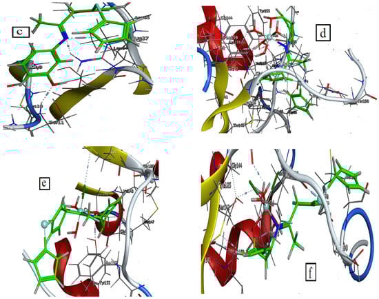 3D plot of the interaction between the receptor of 3HB5 with (a) 3-aminophenol, (b) 2-acetylferrocene, (c) HL, (d) Mn(II) complex, (e) Cu(II) complex and (f) Cd(II) complex.
