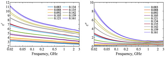 Dielectric spectra of all measured samples are presented in Figure 1. Samples of the same moisture content are represented by the same line color. In order to assess the spread of the spectra of samples of the same moisture content, the relative mean absolute deviation was calculated for each and at each frequency, separately for and . For , the values of did not exceed 2%, with the average value equal to only 0.95%. In the case of , the highest value of was observed at 20 MHz in the case of the lowest moisture content, for which the average value of was only 0.16. The average value of for was 2.2%.