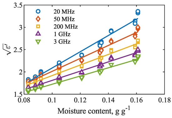 After the dielectric spectra were obtained, the relations between the real part of dielectric permittivity at given frequencies and moisture content were modeled by an equation linear with respect to the square root of :