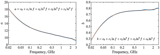 Slope a and intercept b (blue dots) of the relation (Equation (2)) as functions of frequency. The frequency dependencies of the a and b parameters were modeled by a fourth-order polynomial (red lines) with respect to the natural logarithm of the frequency f expressed in GHz, according to Equation (3).