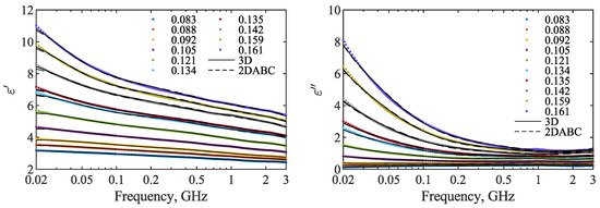 The 3D and 2D-ABC dielectric models, described in Section 2.3, were fitted to all obtained spectra. The results obtained for 10 spectra, one for each value of , are presented in Figure 4. Both models fitted to all measured spectra well. At frequencies close to 20 MHz, the fitted values were slightly lower than the experimental data, especially for 2D-ABC. In the case of the 3D model, the minimum of the fit was 0.0072, maximum: 0.0435 and the mean value: 0.0224. 2D-ABC model exhibited slightly higher , with minimum, maximum and mean values equal to 0.0091, 0.0566 and 0.0283, accordingly.