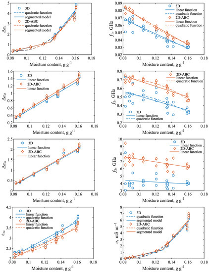 The relations between the obtained dielectric parameters and the moisture content of the seeds were modeled by a linear function (Equation (8)), a quadratic function (Equation (9)) or the segmented model (Equation (10)), as appropriate. The results of the fitting, including the determined parameters, and of the fit are presented in Table 3 and Table 4. In the case of and , the segmented model better fitted the data than the quadratic function. This clearly shows that these parameters increased with the increase in moisture much slower at less than approximately g than at higher values. and were comparable for and obtained from both 3D and 2D-ABC models. The two different slopes of the relation between these parameters might hint that, in the case of low moisture content, all water is held tightly bound to organic matter particles. Then, after a certain threshold moisture value is reached, additional water molecules are more free to rotate in an external electric field, contributing much more to the overall dielectric permittivity value of the sample than in the case of bound water. A basis for this hypothesis is the difference in dielectric properties between the bound or hydrated water and free water states in the soil and biological systems [1]. Examination of this phenomena in seeds requires further research.