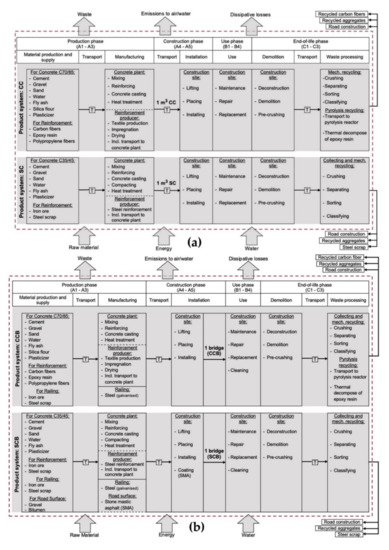 System boundaries of the life cycle assessment of (a) carbon concrete (CC), steel-reinforced concrete (SC) and (b) carbon concrete bridge (CCB), steel-reinforced concrete bridge (SCB) based on DIN EN 15804 [30].