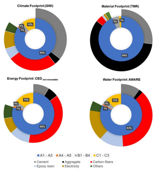 The water footprint of CC is 9.92 m3 weighted water per m³. The production phase contributes to the water footprint with an equally significant share of over 80% mainly caused by the production of the carbon fiber reinforcement. In this regard, cement and aggregates production have a low share of around 14% (Figure 2).