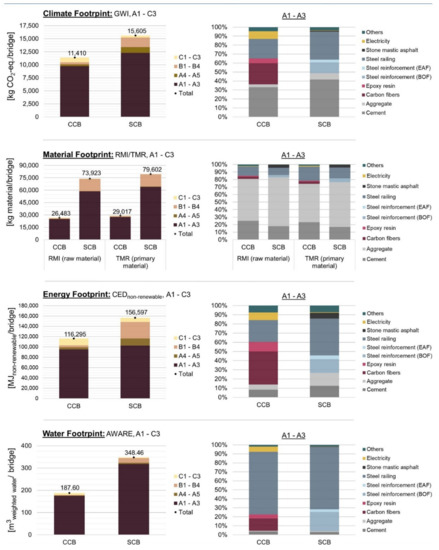 The footprints per 1 m3 of CC and SC are calculated by assigning the LCI results at the material level to the respective selected footprint categories. All results of the impact assessment with regard to the climate, material, energy and water footprints are related to the entire product life-cycle from A1 to C3 (Table 2).