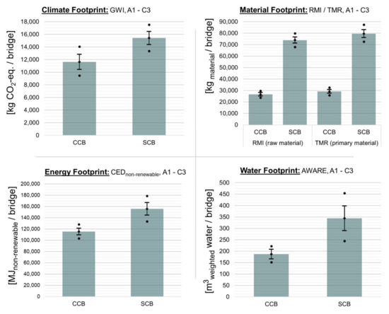 The water footprint of the CCB is in the range between 152 and 222 m3 weighted water (CV = 6.8%) and in the range between 245 and 454 m3 weighted water (CV = 9.6%) for the SCB. This means that savings on water footprint are in the range of 9 and 67%. The overall assessment shows that the standard deviations of the material, energy, and water footprint with regard to the CCB are lower than those of the SCB product system. This fact is due, among other things, to the high absolute deviation and the great influence of the weight of the hot-dip galvanized steel railing. Apart from the climate footprint, there is a 100% probability that environmental impacts can be reduced by manufacturing the bridge from CC. It is certain that significantly large quantities of raw and primary materials will be saved, especially through the use of CC for the bridge superstructure of the CCB.