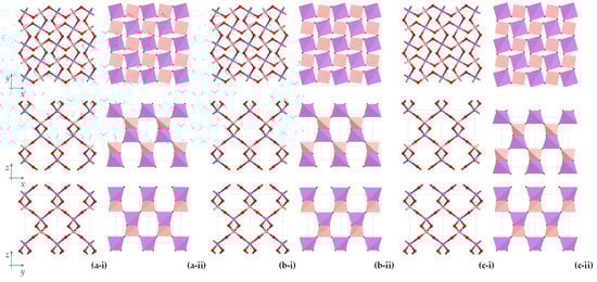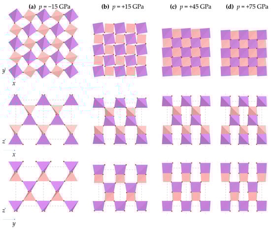 Images showing the projection of the tetrahedra in the (001), (010) and (100) planes at pressures of −15 GPa to +75 GPa in intervals of 30 GPa are shown in Figure 5. Note that given that experimental data at non-ambient pressures over a wide pressures range is not readily available, this work relies on DFT simulations to obtain the crystal structure of BAsO4 over a wide pressure range, comparing whenever possible to existing experimental data (see Figure 6a).