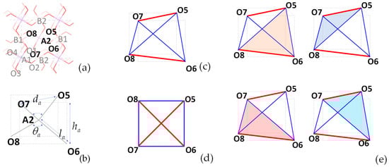 To explain these geometric relationships, without loss of generality, one may look at the tetrahedron (tetragonal disphenoid) at the centre of the unit cell, i.e., the AsO4 tetrahedron having A2 at its centre and O5, O6, O7 and O8 as its vertices (see Figure 2). In this case, the two equal longer sides are O5-O7 and O6-O8, corresponding to the larger bond angles O5-A2-O7 and O6-A2-O8 (Set 1) whilst the other four equal shorter sides are O5-O6, O6-O7, O7-O8 and O8-O5, corresponding to the smaller bond angles O5-A2-O6, O6-A2-O7, O7-A2-O8 and O8-A2-O5 (Set 2). This tetrahedron has four faces, each of which is an isosceles triangle, all of which are congruent. Moreover, as illustrated in Figure 2c, this tetrahedron may be fitted into a cuboid with a square base, where atoms O5 and O7 occupy opposite corners of the top square face whilst the atoms O6 and O8 occupy the other opposite corners on the bottom square face with the result that, when viewed from above, this tetrahedron projects as a square in the plane parallel to the edges O5-O7 and O6-O8. These edges O5-O7 and O6-O8 correspond to the diagonals of the projected square (shown in red in Figure 2), whilst the ‘shadows’ of the other edges correspond to the sides of the projected square (shown in blue in Figure 2). Note that such geometric features are shared by all tetragonal disphenoids, including the three other tetrahedra within the unit cell. Note also that similar properties would also be manifested had the angles O5-A2-O7 and O6-A2-O8 in Set 1 been smaller than the other four angles in Set 2 (which is not the case at ambient pressure), with the ‘diagonal’ edges O5-O7 and O6-O8 always corresponding in full to the diagonals of the projected squares whilst the ‘shadows’ of O5-O6, O6-O7, O7-O8 and O8-O5 (which have a shorter length than the edges themselves) correspond to the sides of the squares. Note also that as a consequence of these features, provided that the tetrahedron remains a tetragonal disphenoid, the edges O5-O7 and O6-O8 necessarily point in two orthogonal directions and form the diagonals of the projected square. Moreover, the line joining the mid-points of these two edges is perpendicular to the two edges with the A2 arsenic atom lying in its centre (a position which corresponds to the location of the centre of the tetrahedron). In other words, the central atom within the tetrahedron bisects a line which is the perpendicular bisector of the two Set 1 edges. Another interesting phenomenon that should be noted is that for each tetrahedron in our system, the sum of the six O-As-O or O-B-O bond angles sum up to approximately 657° (i.e., ≈6 × 109.47°), which as noted by McNelis and Blandino [60] from their examination of many tetrahedral systems, seems to be a value which applies to practically all tetrahedral molecular units.