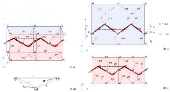 The method by which the a-direction was computed from bond lengths and bond angles. (a) Depicts the crystal in three dimensions, where (a-i) shows 2 × 1 × 1 units cells and (a-ii) shows in more detail the relationship between the parameter a and the parameters da and db; whereas (b) shows the same system as shown in the (b-i) zx-plane and (b-ii) xy-plane.