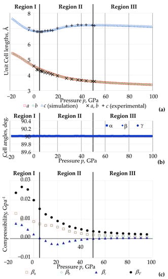 (a) The lattice constants a, b, c as simulated compared with the experimental data (shown as black crosses) as obtained by Haines et al. [3]. Note the excellent agreement between the simulated data and the available experimental data. (b) A confirmation that the lattice cell angles remain 90° throughout the entire pressure range considered means that lattice vectors a, b and c remain aligned with the x, y and z directions respectively. (c) The linear and volume compressibility values as computed from the simulated data. Note that Region II corresponds to NLC in the c direction.