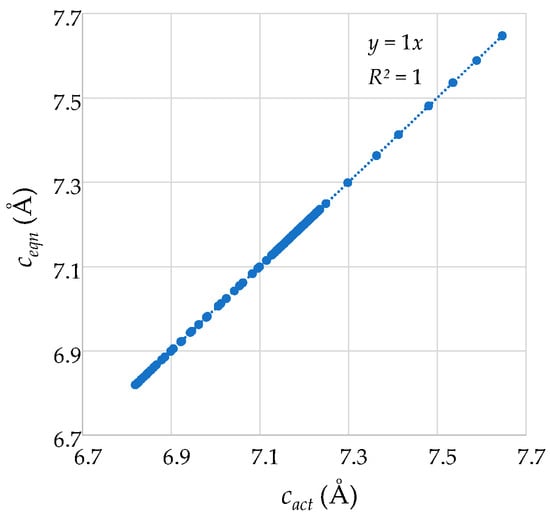 Moreover, the mathematical representation of BAsO4 derived above was found to be fully applicable to the experimental and simulated structuces with the predicted values of the cell parareters as estimated through the mathematical model agreeing perfectly with the ones measured directly. In fact, as shown in Table 2, the predition holds perfectly (100% agreement) for the data obtained experimentally, i.e., ceqn the value of c predicted by Equation (6) is exacly identical to cact, the value of c actually measured and the values of a and b as computed through Equation (19) are equal to those actually measured directly in the experiment and simuations. Moreover, the rule proposed by McNelis and Blandino [60] was also found to be fully applicable to the simulated crystal structure, as shown in Table 1.