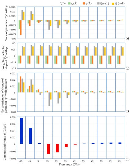 where the derivative terms in Equations (A1), (A2) and (24) are estimated as the slope of the cell parameter vs. p, estimated at a pressure p over five consecutive data points (i.e., over a pressure range of p ± 2 GPa) asuming a linear relatioship within the pressure range p ± 2 GPa.