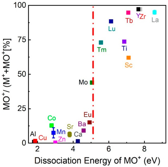 Pulsed laser deposition (PLD) is regularly used to deposit complex oxides, due to its ability to congruently transfer the target composition to the deposited film [1,2]. The deposition is conducted using a pulsed KrF laser (λ = 248 nm corresponding to 4.99 eV/photon) with a pulse length of a few 10 ns in an O2 background gas. The wavelength, combined with the pulse length, results in a plasma plume consisting largely of monoatomic plasma species (excited, ion, and neutral species). Adding a background gas moderates the kinetic energy of the expanding plume species, forming additional ions and excited state species. In addition, a sufficiently large oxygen background partially compensates for the loss of oxygen in the as-deposited oxide films. As a consequence, most of the oxygen in the film originates from the background gas, at least for the case of La0.6Sr0.4MnO3 [3]. Therefore, the interaction between the plume species and the background gas is of primary concern. As discussed in [4,5], the presence of an O2 background changes the hydrodynamics of the plume expansion due to scattering between plume species and O2 molecules. As a result, chemical reactions can occur with mainly di-atomic metal–oxygen (MO and MO+) species as reaction products [3,6,7,8], and the formation of MO and MO+ ions in the plume is strongly related to their dissociation energies [9]. This is shown in Figure 1, where the relative number of MO+ species (MO+/M+ + MO+) is plotted vs. the MO+ dissociation energy, with data taken at an oxygen deposition pressure of 1.5 × 10−1 mbar. Data are taken from [9] with Sc and Eu added to the figure. At this pressure, the results resemble a chemical equilibrium of the kind: