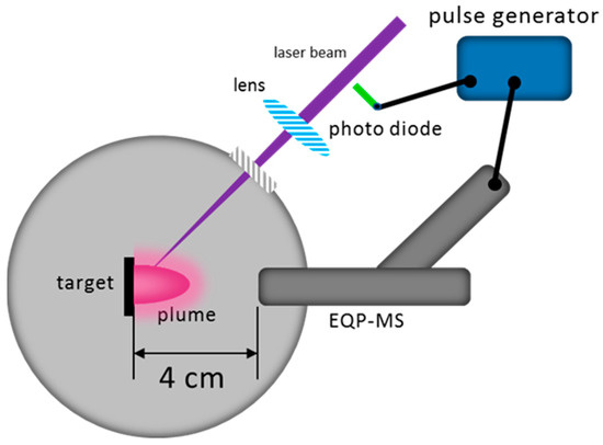 Ion energy analyses of the plasma plume were performed in a dedicated UHV chamber as shown in Figure 2. An energy-resolved mass spectrometer (Hiden EQP-MS, Hiden Analytical, Warrington, UK) was installed on the chamber for the ion energy analysis. The Hiden EQP-MS system combines an electrostatic energy analyser and a quadrupole mass spectrometer in tandem to measure the ion energy distributions (IED) for each specific ion. Due to the high materials flux per laser pulse, a 30-µm diameter sampling orifice was used and positioned at 4 cm from the target surface normal to the plume expansion axis. In addition, an appropriate tuning of the lenses was performed to avoid chromatic aberration and to ensure a stable ion transmission. For the ablation of the targets, a KrF excimer laser (Lambda Physik LPX 300, Coherent, Göttingen, Germany, 20 ns, λ = 248 nm, repetition rate: 5 Hz) was used with a fluence of 2 J/cm2 and a laser spot of 1 × 1 mm2. In order to capture the transient plasma plume, the mass spectrometer was triggered and gated by a pulse generator connected to a photodiode. The pulse generator provided a TTL pulse to the mass spectrometer with a pulse width of 1 ms, which was much longer than the time the plume species required to reach the mass spectrometer. Thus, the mass spectrometer collected all the required species per trigger pulse. To record the full IED, the measurement was started at negative energy values. This is an instrumental artifact due to the applied electric field at the orifice to collect either positive or negative species. The shifted IED are shown as measured.
