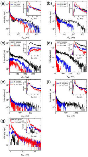 The ablation of La0.33Ca0.67MnO3 in vacuum Mn+ species (m = 55) had a low energy maximum with Ekin,max < 2 eV and a significant energetic tail up to 400 eV (Figure 3). With increasing O2 pressure, these high kinetic energies were reduced to less than 200 eV (Figure 3a), and in Ar, a substantial reduction to around 50 eV took place (Figure 3b). In addition, the intensity of the low energy peak decreased at first, in both atmospheres, before increasing to very high intensity values at 5 × 10−2 mbar (see Figure 3 inserts). This was also the pressure regime where the mean free path was of the order of the target–substrate distance and smaller, and hence the influence of collision became increasingly more important. Looking at Ca+ (m = 40), the high kinetic energies (300 eV in vacuum) were reduced with increasing pressure to <100 eV in O2 (Figure 3e) and <50 eV in Ar (Figure 3f), and Ekin,vac > 500 eV for La+ (m = 139) to less than 200 eV in O2 (Figure 3c) and approx. 50 eV in Ar (Figure 3d). Analogous to Mn+, the intensity of the low energy Ca+-peak decreased at first, before increasing to a very high intensity value at 5 × 10−2 mbar. The situation for La+ was different; the intensity of the low energy peak decreased with increasing O2 background pressure. The pressure dependence of the IED for LaO+ in O2 (Figure 3g) showed a different feature. The IED expanded from less than 20 eV in vacuum to 50 eV with increasing O2 pressure. The overall intensity of the IED as well as the intensity of the low energy LaO+-peak increased with increasing pressure while the position of the maximum remained largely unchanged with the tendency to be reduced to smaller energies. The latter was different to the low energy part of the IED for the single ionic species where a clear shift of the position for the low energy maximum was observed.