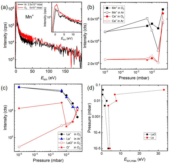 (a) Comparison of IEDs for Mn+ in 2 × 10−2 mbar Ar and 5 × 10−2 mbar O2. (b) Pressure dependence of Mn+ and Ca+ in O2 and Ar. (c) Pressure dependence of La+, O+ and LaO+ in O2 and Ar. (d) O2 pressure vs. Ekin,max of the ion energy distribution for La+ and LaO+.
