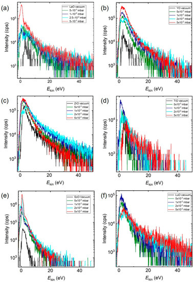Having identified the low kinetic energy range to be favourable for the formation of LaO+ at a high O2 background pressure, we next studied IEDs for a range of different MO+-ions (M = Zr, Y, Ti, Sc, Lu) with dissociation energies larger than 5.12 eV to confirm whether the plasma processes leading to the formation of these species were comparable. Figure 5 shows the IEDs of MO+ species selected from Figure 1 measured at different O2 pressures (ZrO+ = 7.76 eV, YO+ = 7.51 eV, TiO+ = 6.88 eV, ScO+ = 7.11 eV, and LuO = 6.89 eV) [21,39,40]. Irrespective of the element and pressure, all MO+ ions showed a maximum in the IED below 10 eV with an increase in the intensity of Ekin,max with increasing background pressure. This was the same pattern as observed for La+/LaO+, suggesting a preferential reaction between the background gas molecules and low energy ions. Typical for these MO+ binaries with Ediss > 5.12 eV were the pressure dependences shown in Figure 5a–d. Ekin,max was observed as shifting to smaller energies with increasing pressure, with a simultaneous increase in the number of species measured. Additionally, for a background pressure of a few 10−2 mbar, the IED developed a double peak structure, indicating a slowing-down of as-ablated, and, during the expansion, created MO species. The pressure dependence shown in Figure 5e,f was also frequently encountered, but the origin remains unclear at present. However, the increase in total area with increasing pressure was measurable with ~20% for LuO. As already discussed, the chemical reaction cross section decreased with increasing collision energies [8]. A possible scenario for the gas phase oxidation reaction during the plume expansion in O2 for other metal species was therefore analogous to La+: