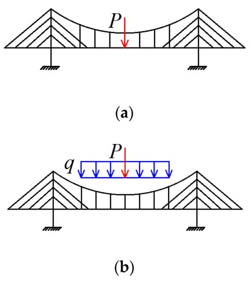 - The live load caused by traffic and walking people could be replaced by a distributed load and concentrated load for static analysis. Meanwhile, the dead load of the bridge could also be equivalent to a uniformly distributed load. According to the superimposition principle, the load on the bridge can be assumed to be a combination of the distributed load q and concentrated load P, as shown in Figure 2. The different combinations of the distributed load q and concentrated load P are considered in the following calculation.