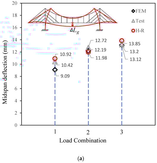 Figure 8a shows that the fitting among the results from the three methods is good for midspan deflection. The maximum gap is between the results from the Hellinger–Reissner method and the finite element method, with an error of 10% under load combination 1. Meanwhile, for the same type of load combination, the error between the test and the Hellinger–Reissner method is less than 5%.