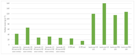 Based on the conducted tests, two-layer laminate (15 g·m−2 PE foil + 15 g·m−2 PP non-woven), the knitwear single cotton 120 g·m−2, and knitwear polyester interlock 120 g·m−2 were selected for further research.