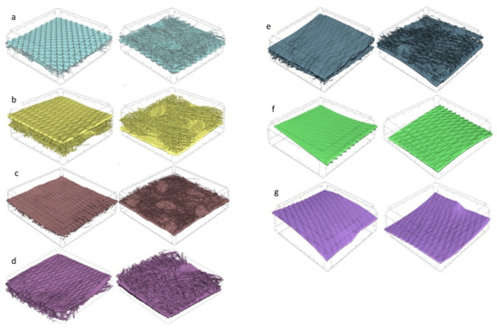 The micro-CT 3D reconstructions also show the structures of the laminates from the non-woven side as well as the foil on the laminates and the structures of the foils. We can observe the places where the fibers were melted during the calendering process.