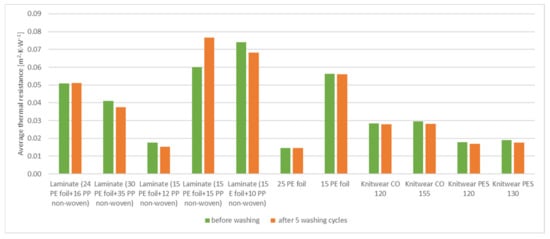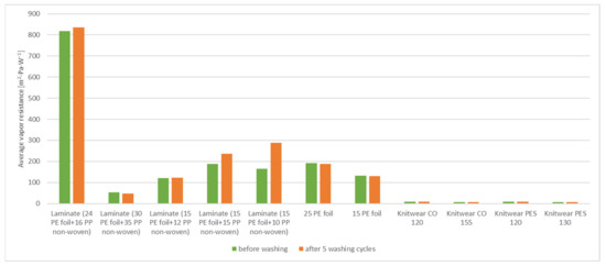 The washing process slightly affected the results of the measurements of heat and vapor resistance of the tested materials. In some cases, the vapor resistance and the heat resistance of the tested samples increased, and in some cases, they decreased. The biggest difference before and after the washing process is observed in two-layer laminate (15 g·m−2 PE foil + 10 g·m−2 PP non-woven) and two-layer laminate (15 g·m−2 PE foil + 15 g·m−2 PP non-woven). The foil samples had the lowest differences in vapor resistance and heat resistance.