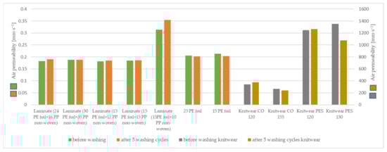 The laminates tested contained a non-woven fabric and a foil in their structure. The foil resists both vapor and heat, thus reducing air permeability. The two-layer laminate (15 g·m−2 PE foil + 10 g·m−2 PP non-woven) showed the highest air permeability (0.314 mm·s−1), while the two-layer laminate (15 g·m−2 PE foil + 12 g·m−2 PP non-woven) had the lowest air permeability (0.181 mm·s−1). The air permeability of the tested samples before and after washing did not change significantly, for some samples it remained the same. The air permeability of two-layer laminate (24 g·m−2 PE foil + 16 g·m−2 PP non-woven) and two-layer laminate (30 g·m−2 PE foil + 35 g·m−2 PP non-woven), two-layer laminate (15 g·m−2 PE foil + 12 g·m−2 PP non-woven) and two-layer laminate (15 g·m−2 PE foil + 15 g·m−2 PP non-woven) are at the same level. The only two-layer laminate (15 g·m−2 PE foil + 10 g·m−2 PP non-woven) had a different (higher) permeability. For knitted fabrics, the highest permeability was in the knitwear polyester interlock 130 g·m−2, while the lowest was in the knitwear single cotton 155 g·m−2. The biggest difference between the washed and unwashed knitwear sample was for the knitwear polyester interlock 130 g·m−2.