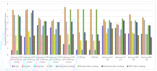 A bigger disparity was found in Koshi value with a maximum of 4.65 for two-layer laminate (15 g·m−2 PE foil + 12 g·m−2 PP non-woven) and a minimum of 0.72 for two-layer laminate (24 g·m−2 PE foil + 16 g·m−2 PP non-woven). Vapor-permeable PE foil 15 g·m−2 showed the worst fullness property with a value of 3.21 and two-layer laminate (30 g·m−2 PE foil + 35 g·m−2 PP non-woven) is found to be the bulkiest one. Numeri value of the knitwear single cotton 155 g·m−2 was the lowest (4.79), meaning that it was the harshest to touch, while the two-layer laminate (15 g·m−2 PE foil + 10 g·m−2 PP non-woven) showed the highest smoothness.