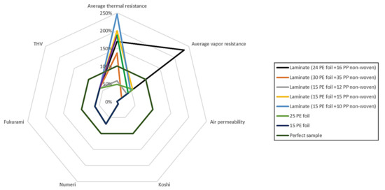 On the other hand, analyzing the vapor resistance, the most optimal parameters were characterized by vapor-permeable foil 25 g·m−2 and two-layer laminate (15 g·m−2 PE foil + 15 g·m−2 PP non-woven) and two-layer laminate (15 g·m−2 PE foil + 10 g·m−2 PP non-woven).