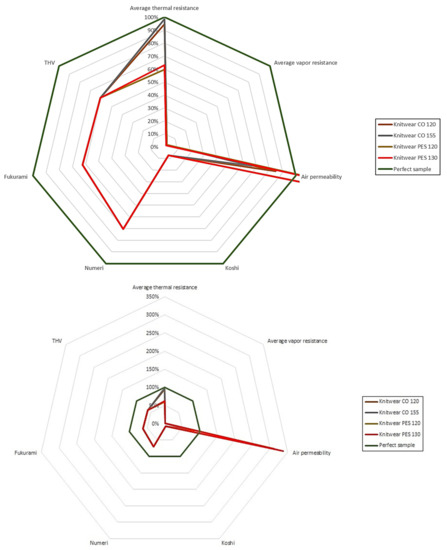 Analyzing the above data, it was observed that cotton knitted fabrics are the closest to the ideal among the knitted fabrics tested, while in the case of laminates, the closest to the ideal was two-layer laminate (15 g·m−2 PE foil + 15 g·m−2 PP non-woven).