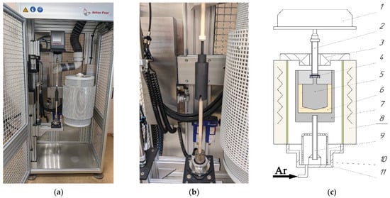 Exterior of rheometer FRS-1600 (a). Illustration of outer and inner cylinders (b) and scheme of the rheometer (c): 1—measuring head; 2—upper ceramic rod for fixing the rotor; 3—heat insulator cover; 4—system for attaching the rotor to the upper rod (pin + restrictive ring); 5—rotor (inner cylinder); 6—melt; 7—crucible (outer cylinder); 8—resistance shaft furnace with vertically arranged SiC heaters; 9—lower ceramic rod for mounting the crucible; 10—gas divider; 11—bottom cover with heat-insulating inserts.