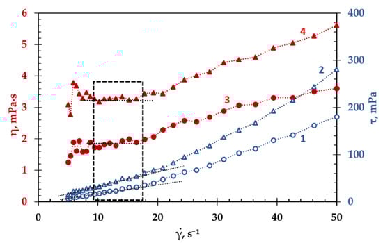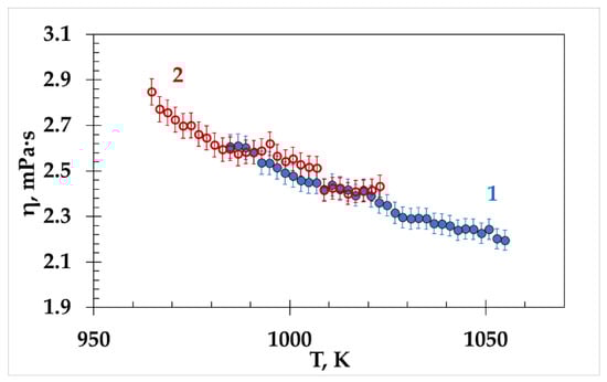 Thus, to increase the measurement time for each point at low shear rates, it is possible to obtain values with the minimum deviation from the average value, but this will lead to a significant increase in the duration of experiment. According to the viscosity curves (Figure 2), it is possible to determine the range of the shear rate parameter, in which the viscosity does not depend on the shear rate—that is, when the melt behaves like Newtonian fluid. This interval was 9–19 s−1 for both melts, (LiF-NaF-KF)eut and (NaF-KF)eut. The viscosity temperature dependence was measured at a cooling rate of 2 deg/min and a constant shear rate of 12 s–1.