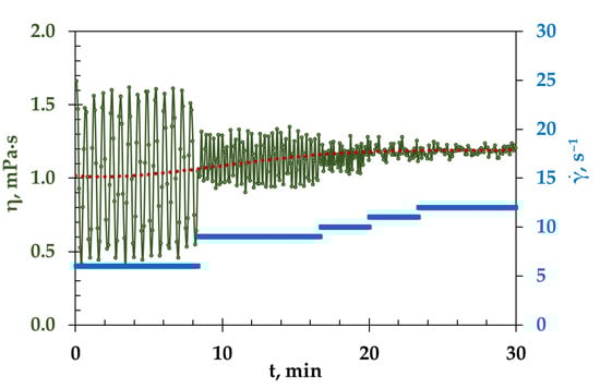 The area of laminar flow can be determined both from the viscosity and flow curves. It follows from the Figure 2 that the values of the maximum shear rate at which the transition from laminar to turbulent flow occurred, determined from both curves, are in a good agreement. This transition occurs at a shear rate of 19 s−1. However, the viscosity curves indicate that a large spread of points was observed for both compositions at low shear rates (below 9 s−1). This was due to the applied measurement conditions, under which the specified measurement time did not correspond to the rate of the laminar flow. For example, Figure 3 illustrates the viscosity of the melt (LiF-NaF-KF)eut at different shear rates, and the measurement time of each point was always constant: 5 s. The greatest scatter of points (marked in green in Figure 3) relative to the average value (red line) was observed at low shear rates. The higher the shear rate (under conditions of laminar flow), the smaller the spread of values. The viscosity values for the (LiF-NaF-KF)eut are scuttered within 1% at the shear rate of 12 s−1.