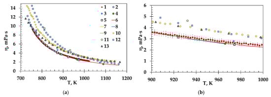 Viscosity of molten (LiF-NaF-KF)eut in the temperature ranges 715–1170 K (a) and 900–1000 K (b) obtained by different studies: 1—this work, 2—An [], 3—Cohen [], 4—Tobias (capillary method) [], 5—Torklep [], 6—Cibulkova [], 7—Kubikova [], 8—Chrenkova [], 9—Junz [], 10—Merzlyakov [], 11—Tobias (rotational method) [], 12—Powers [], 13—Vriesema []. Data notation in subfigure (b) is the same as in subfigure (a). Figure 4a was partially adapted with permission from Ref. [], 2022, AIP Publishing LLC.