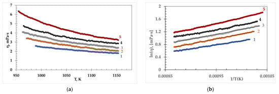 where η is the dynamic viscosity, Pa‧s; is the pre-exponential factor defined from the experimental data, Pa; E is the activation energy for viscous flow, J/mol; R is the universal gas constant 8.3145 J/(K‧mol); T is temperature, K. In semilogarithmic coordinates, the viscosity temperature dependence is described by a general linear equation: