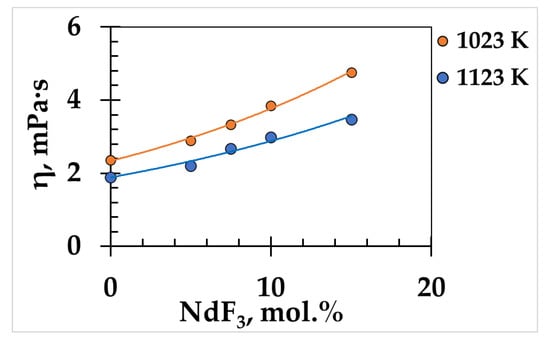 The viscosity of the (NaF-KF)eut-NdF3 melt grows with increasing NdF3 content (Figure 6).