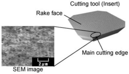 In works [,,,,,], it was noted that in order to improve the operational characteristics of the working surfaces of products, for example, working in conditions of increased friction, it is necessary to apply a textured relief. A textured relief is applied to individual surfaces requiring certain properties. Surface texturing is a method of surface functionalization widely used throughout the world. This is used in various fields: medical implants, wettability tuning, optical properties, hybrid bonding, bond enhancement, or cutting tools [,,,]. The most common patterns of textured surfaces are dimples, lines (parallel and hatching), square, conical, rhombic, wavy texture, and annular (bulge and smooth corrugation) [,]. Surface microtexturing is widely used to improve the tribological properties of cutting tools, such as improving frictional performance and wear protection. The types of patterns produced on the surfaces of the cutting tool were most commonly microgrooves, microholes, microstrip grooves, and microgrooves. In the works [,,,,], the influence of polycrystalline diamond tools with microgrooves, made using a fiber laser, was studied (Figure 1).