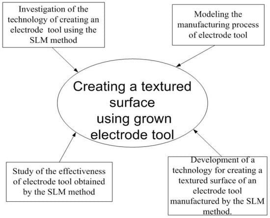 The performance of the EDM ET and the applicability of the ET produced by the selective laser melting method for EDM have not been fully studied [,,,,,]. The development of EDM technology by grown ETs obtained by the SLM method for applying a textured surface is relevant [,] (Figure 2).
