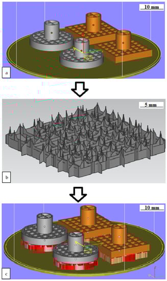 The preparation of the model for manufacturing was carried out in the Materialize Magics environment. A cylinder with dimensions of 70 × 40 mm was the working space of the installation for making a model (Figure 5a).This allowed to reduce the time and reduce the cost of manufacturing. Supports were created in the minimum volume. This volume was sufficient to hold the grown product. (Figure 5b). The support type was a block. The support material entered the main part to a depth of 0.1–0.2 mm for reliable fastening of the part to the supports (Figure 5c).
