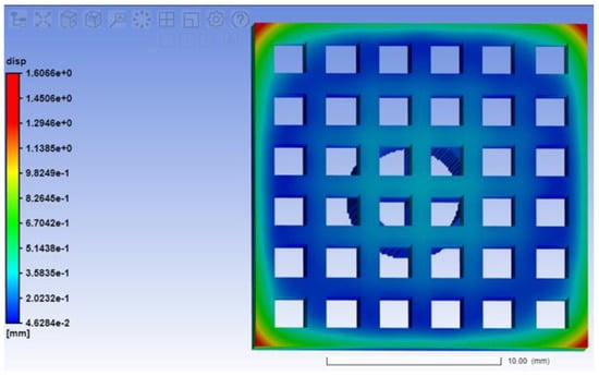 As a result of calculations for internal stresses when constructing the ET, it was revealed that the largest displacements are observed in the corners of the electrode (1.6 mm) (Figure 6).