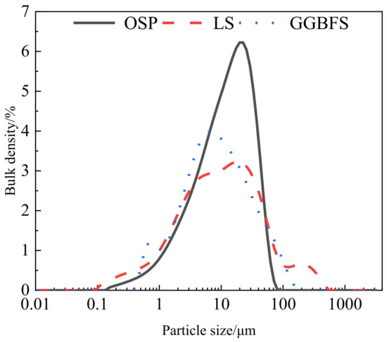 The raw materials include OSP, GGBFS, LS, Portland cement (PO.42.5), standard sand, and water. PO.42.5 grade cement from Shenyang Shanshui Park Cement Co., Ltd. (Shenyang, China) Was used as a primary binder in this study. Oyster shells were provided by Rongcheng Xingyang Fish Flour Factory in Rongcheng, Shandong Province, China. The shells were cleaned with water to remove any residues [29] that may remain in the shells, then dried at 105 ± 5 °C for 24 h to remove any moisture content, and the OSP samples were then calcined for 2 h at 850–950 °C, as recommended by Li et al. [30] According to Letwattanaruk et al. [31], who used OSP as SCM, the average particle size range should be from 0.5 to 40 μm. GGBFS was sourced from Jiyuan Steel Plant in Jiyuan, Henan Province, China. LS was obtained from Tianyuan New Energy Materials Co., Ltd. located in Taiyuan, Guangxi Province, China. The chemical compositions of the three types of materials are shown in Table 1. The specific surface area in Table 2 and the particle size distribution of OSP, LS, and GGBFS are shown in Figure 1 via Brunauer–Emmett–Teller (BET) surface area analyses. The XRD in OSP was tested ranging from 5° to 60° 2θ. Figure 2 shows that the main mineral composition of the OSP is dolomite, followed by quartz.