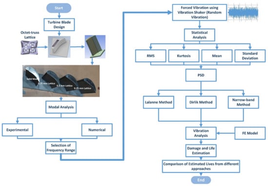 This work aims to estimate the vibration-based fatigue life of octet-truss lattice-based turbine rotor blades. The framework of this research is illustrated in Figure 1. In the first step, turbine blades were designed and manufactured via additive manufacturing. After manufacturing, modal analysis was performed on the blades to determine their natural frequencies and associated mode shapes. Both experimental and numerical techniques were utilized for modal analysis. After getting modal parameters, forced response analysis was performed on each blade by applying random vibration using a vibration shaker. The input signal and the response were measured using uniaxial and triaxial accelerometers, respectively. After data acquisition, statistical analysis was performed to obtain the power spectral density of each signal. The data were further processed in nCode® Designlife® to obtain the cycle counts using PSD cycle counters. Three approaches, namely, Lalanne, Dirlik and narrow band, are utilized for the cycle counting. After cycle counting, vibration analysis in nCode® Designlife® is performed with PSD cycle counts and finite element model (FEM) as inputs. From vibration analysis, both damage and life cycle estimates are obtained.