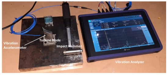 An impact testing (ISO 7626-5) technique was employed for experimental modal analysis. Turbine blades were mounted on a rigid mild steel base plate. A triaxle piezoelectric accelerometer (PCB 356A01) was mounted on the blade using adhesive. The blade was excited by a modally tuned impact hammer (PCB 086C03), and the response was measured using vibration analyzer (RIONOTE SA-A1). The measured response/input (g/N) was plotted against the frequency range to obtain the natural frequencies of the blades. A frequency range of 0–7 KHz was used with a sampling rate of 25.6 kilo samples per second. The experimental setup for modal analysis is shown in Figure 3.